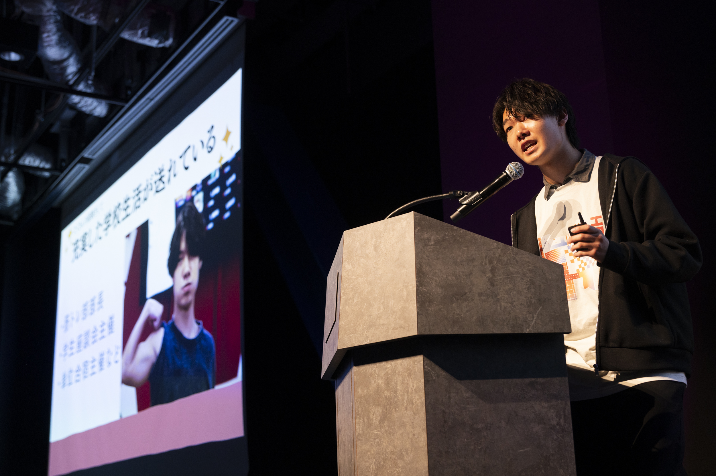 トップバッターは筋トレ部部長。「日本の大人の死んだ目に輝きを。」をテーマに、日本の大人たちが自己決定によって幸福度の高い人生を送れる社会を実現するため“脳筋トレプロジェクト”を発案しました。